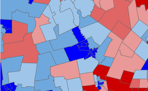A more meaningful approach to analyze the House vote is to calculate the percentage of the total vote each party receives in each district. The map at the bottom of this post illustrates the results for the 2012 general election in the non-floterial districts. As you would expect, the results generally mirror the districts’ Partisan Voting Index (PVI). This scatter plot, which includes the results for each district in which both parties had a candidate on the ballot, charts the relationship.