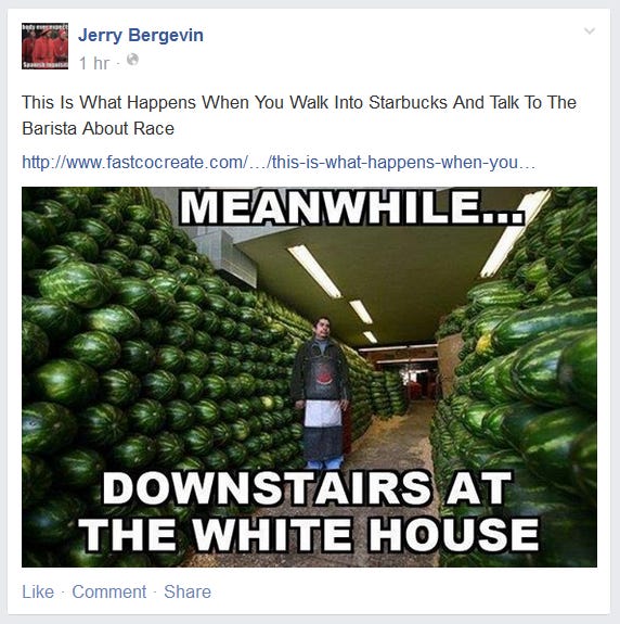 The image was included with a link to an online article disparaging Starbucks’ “Race Together” campaign, which encourages baristas to discuss race relations with customers.