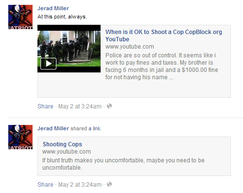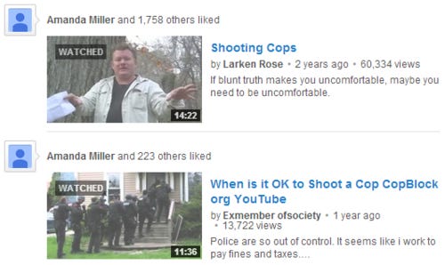 On her YouTube page, where Miller posted videos she and her husband Jerad Miller made during their three days at the Bundy ranch, Amanda Miller liked “When should you shoot a cop?” and Larken’s follow-up video, “Shooting Cops." On Facebook, Jerad Miller posted a link to Rose’s "When is it OK to shoot a cop?” and answer, “At his point, always.”