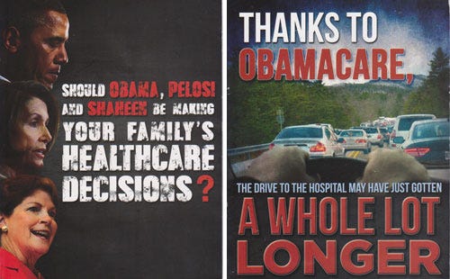 The mailings are all variations on a theme. “Should Obama, Pelosi and Shaheen be making your family’s healthcare decisions?” one asks. “Thanks to Obamacare, the drive to the hospital may have gotten a whole lot longer,” declares another.