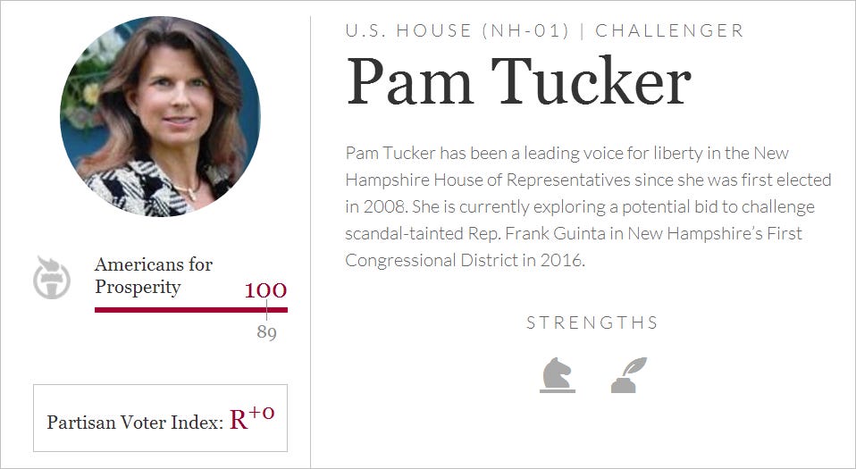A DC-area consulting firm backed by the Koch brothers network is helping Republican state Rep. Pam Tucker raise money for her exploratory campaign to challenge Congressman Frank Guinta in the state’s 1st congressional district.