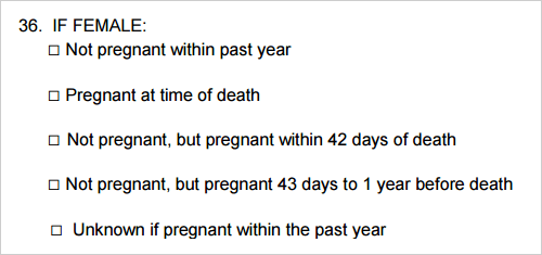 As O’Brien noted in his post, the U.S. began switching over to a new death certificate form in 2003. This form added a dedicated question to determine if a woman was pregnant at the time of death, within 42 days of death or within the past year: