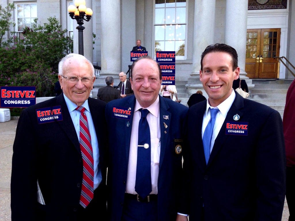 The photo appears to have been taken during an Estevez campaign rally. The three men are festooned with Estevez for Congress lapel stickers. Estevez campaign signs fill the background and adorn the lectern.