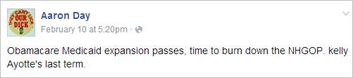 A group of disaffected Republicans, led by Free State Project chair Aaron Day, is working to obtain signatures for a slate of candidates to run as independents in the November general election with the intent of punishing the GOP for supporting Medicaid expansion. “[T]ime to burn down the NHGOP,” Day announced.