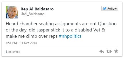 Closer to home, Baldasaro’s complaint mirrors blatant acts of political retribution from the time when O'Brien was making the seating chart. Rep. Tim Copeland (R-Stratham), a former law enforcement officer who was injured in the line of duty, told the Portsmouth Herald he lost his aisle seat in 2012 after opposing O'Brien’s agenda: