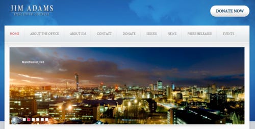 Jim Adams, Republican candidate for the District 4 Executive Council seat held by Democrat Chris Pappas, has a spectacular photo of the Manchester skyline on his campaign web site – Manchester, England. Oops.