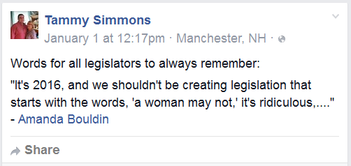 When the “Nipplegate” controversy broke, several Republican women lawmakers came to Bouldin’s defense. One was Rep. Tammy Simmons (R-Manchester), who offered an unambiguous show of support on Facebook. “I am as GOP as it gets……I agree with Amanda,” she wrote.
