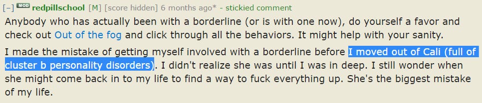 Similarly, another reference to living in California appears in the version of a RedPillSchool comment captured on May 9, 2016 that did not appear in the version captured the day after it was originally posted on October 27, 2016.