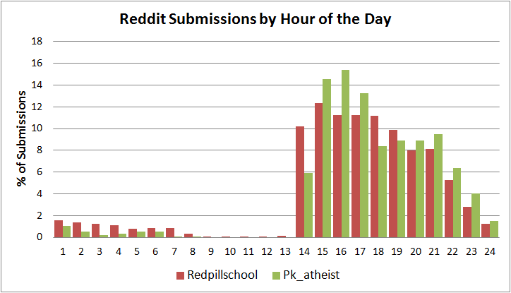 Baumgartner analyzed the time of day pk_atheist and redpillschool posted messages on Reddit and concluded “there is a strong correlation between the two.” He noted “pk_atheist has far less posts than redpillschool by close to an order of magnitude, but there is still enough data to draw some statistical significance.”