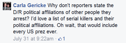 Gericke doesn’t think that’s fair. “Why don’t reporters state the D/R political affiliations of other people they arrest?” she asked on Facebook. “I’d love a list of serial killers and their political affiliations. Oh wait, that would include every US prez ever,” she wrote.