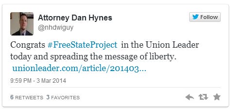 Hynes, who bills himself as “DWI Guy,” lists his membership in the NRA, Freedom Works and Americans for Prosperity on his campaign website. He doesn’t mention any affiliation with the Free State Project, but he describes himself as a “FSP mover” in a message on the Free State Project Forum seeking campaign volunteers: