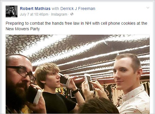 Rob Mathias, an early mover who blogs at The Voluntaryist Rebel and Free Keene, recently posted a photo from a Free Staters’ New Movers Party featuring several men “talking” on cookies decorated to resemble cell phones. “Preparing to combat the hands free law in NH with cell phone cookies,” Mathias wrote.