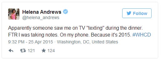 The woman on the phone is Helena Andrews, Washington Post columnist and author of “Bitch is the New Black.” After the image went viral, Andrews acknowledged she was the woman pictured on her phone. “Apparently someone saw me on TV ‘texting’ during the dinner,” she tweeted. “FTR I was taking notes. On my phone. Because it’s 2015.”
