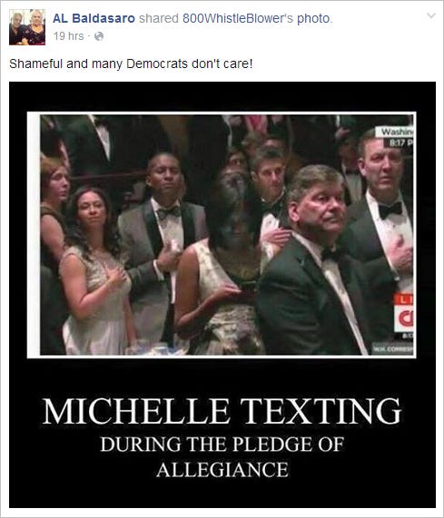 Yesterday, state Rep. Al Baldasaro took to Facebook to heap scorn on First Lady Michelle Obama. The Londonderry Republican posted a meme showing an African-American woman staring intently at her smartphone while everyone else in the photo is standing solemnly with hands over their hearts. “Michelle texting during the Pledge of Allegiance,” it read.