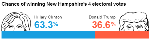 In its “polls-plus forecast,” which factors in polls, the economy and historical data, FiveThirtyEight projects Clinton will win New Hampshire by just under three points, 47.5 percent to 44.8 percent, which translates to a 63 percent win probability. (FiveThirtyEight’s “polls only forecast” has Clinton winning by a larger 47.5 percent to 42.7 percent margin with a 72 percent win probability.