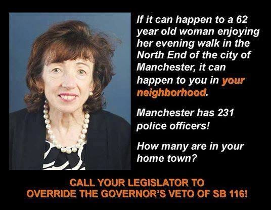 “If it can happen to a 62 year old woman enjoying her evening walk in the North End of the city of Manchester, it can happen to you in your neighborhood,” the meme reads. “Manchester has 231 police officers! How many are in your home town?”