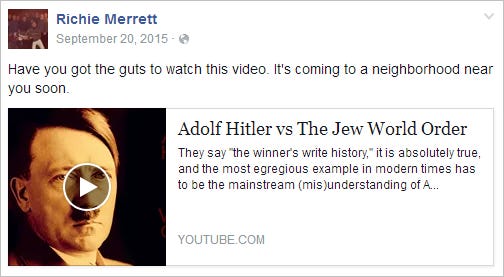 A YouTube video by Holocaust denier Eric Dubay, titled “Adolf Hitler vs The Jew World Order,” is among the items Merrett has shared on social media. “Have you got the guts to watch this video,” Merrett asked. “It’s coming to a neighborhood near you soon.”