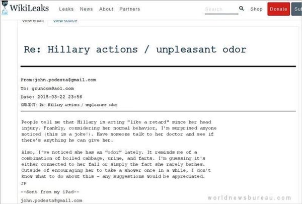 “People tell me that Hillary is acting ‘like a retard’ since her head injury,” the email read. “Frankly, considering her normal behavior, I’m surprised anyone noticed! (this is a joke!) Have someone talk to her doctor and see if there’s anything he can give her.”