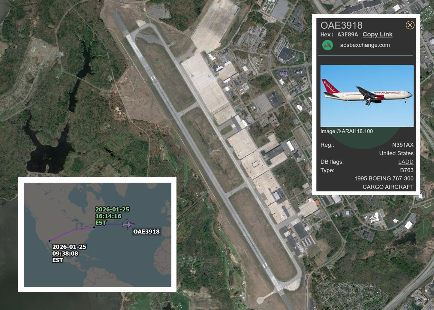Jan. 25: Omni flight OAE3919 arrived from Phoenix at 1:53 p.m. After two hours on the ground, the Boeing 763 departed for Egypt and continued to Kuwait. It returned to Phoenix on Jan. 27 with refueling stops in Sofia, Bulgaria, and at Pease.