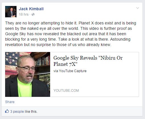Kimball’s latest warning concerns the Nibiru cataclysm, an impending doomsday event involving a supposed collision or near-miss with a heretofore secret planetary object named Nibiru or Planet X. “They are no longer attempting to hide it,” Kimball wrote on Facebook yesterday. “Planet X does exist and is being seen by the naked eye all over the world.”