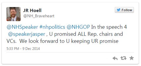 “It’s official, many on list vote Dem,” tweeted Rep. Al Baldasaro (R-Londonderry) who refused to accept a chair position under Jasper. “Only a few Conservatives accept to serve on the Democrat Appointed Speakers Leadership Team,” he added.