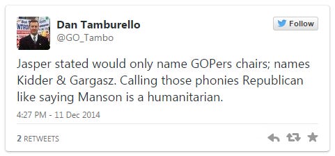 Rep. Dan Tamburello (R-Londonderry) – self-proclaimed warrior for truth, justice, traditional values and the American way – singled out chairs David Kidder (R-New London) and Carolyn Gargasz (R-Hollis). “Calling those phonies Republican [is] like saying Manson is a humanitarian,” he tweeted.