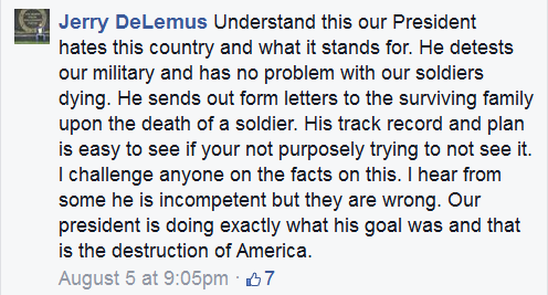 “Understand this our President hates this country and what it stands for,” Delemus continued. “He detests our military and has no problem with our soldiers dying. He sends out form letters to the surviving family upon the death of a soldier.”