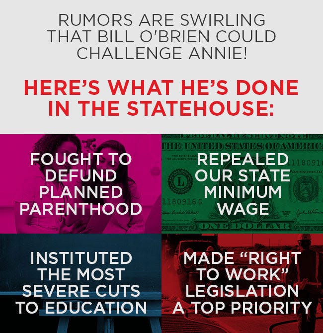 The message goes on to offer a synopsis of O’Brien’s legacy as House speaker, when he “fought to defund Planned Parenthood, repealed our state minimum wage, instituted the most severe cuts to education and made ‘right to work’ legislation a top priority.”
