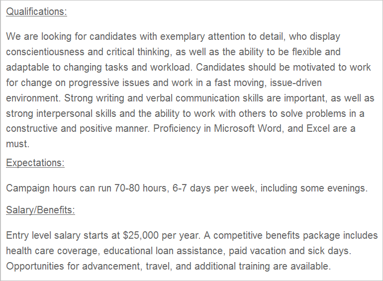 Regardless of the altruistic orientation or future political ambitions of the people hired to get the work done, campaign jobs are just like any other job that paid workers perform to meet the productivity standards of their managers and bosses.