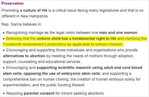 As we noted earlier, Garcia’s position that the Fourteenth Amendment to the U.S. Constitution prohibits abortion is virtually identical to the “personhood” plank adopted by the New Hampshire GOP last week.