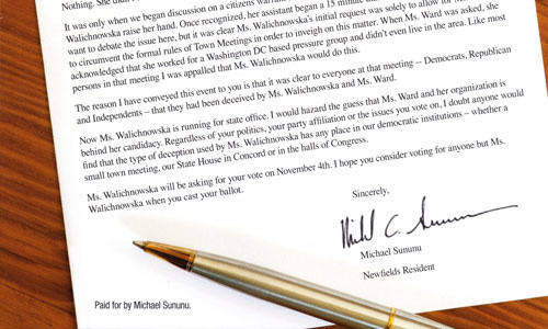 Toni, a Newmarket blogger, first reported on the mailer in which Sununu attacks Walichnowska for her actions during a Newfields Deliberative Session when she was successful in having an article placed on the ballot regarding the Citizens United Supreme Court ruling.