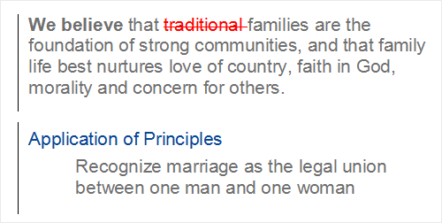 They propose removing a reference to “traditional families” as the “foundation of strong communities” – but continue to declare marriage is a “legal union between one man and one woman.”