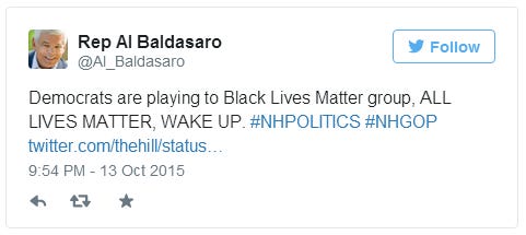 “Democrats are playing to Black Lives Matter group, ALL LIVES MATTER, WAKE UP,” declared Rep. Al Baldasaro (R-Londonderry).