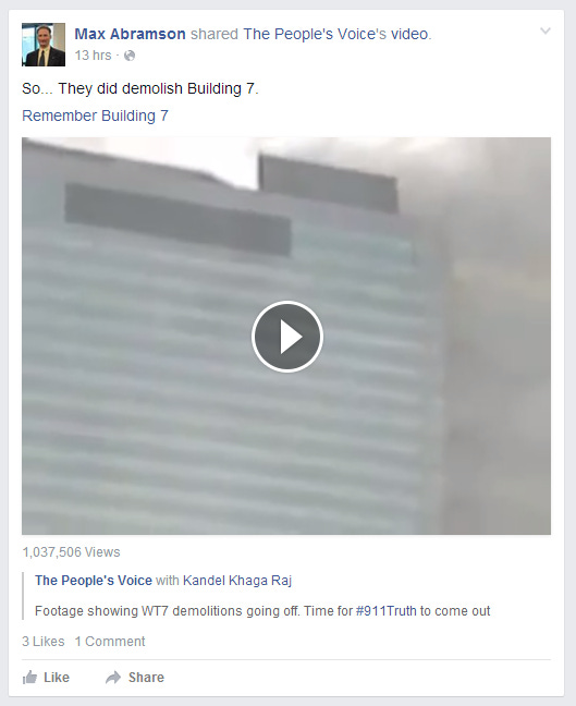 “So… They did demolish Building 7,” he wrote. It was the second truther video Abramson has posted in as many weeks.
