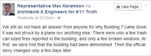 “We still do not have an answer from anyone for why Building 7 came down,” Abramson wrote on Facebook. “It was not struck by a plane nor anything else. There were only a few trash can sized fires reported in the building, and only a few broken windows. At first, we were told that the building had been demolished. Then the official story changed only a few days later.”