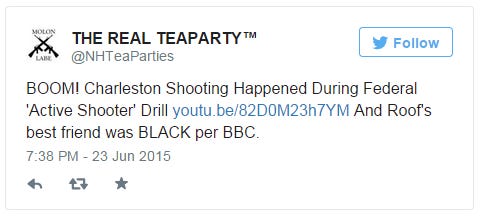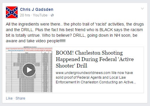 The messages link to a four minute YouTube video that claims to have “solid proof” that federal agents and local law enforcement were conducting an “Active Shooter Drill” in Charleston on the day of the shooting. “They were already in position and this is why FBI was on the scene like lightning,” the author wrote. “There is no denying the Proof we now have. Evidence continues to mount!”
