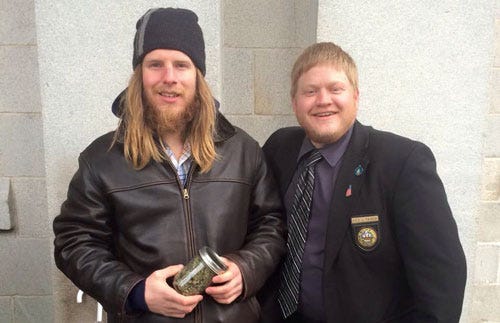 Free Keene reported Tasker was spotted toking up outside the State House during last month’s 420 protest and posing for a photo with “a big jar of primo cannabis:”