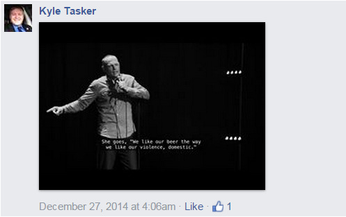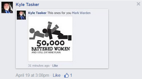 Tasker, you may remember, made national headlines last year when he posted a crude joke about domestic violence on a public Facebook page. For those who might have missed it on the first go round, he recently re-posted the Miscellany Blue screen shot of that original post: