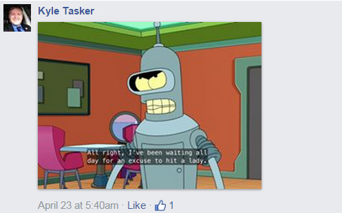 Jokes about domestic violence are a recurring a theme from Tasker. Last week, he posted this image from Futurama with the caption, “All right, I’ve been waiting all day for an excuse to hit a lady:”