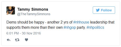 Not so fast, said some outgoing lawmakers who went public with their displeasure. “Dems should be happy,” tweeted Rep. Tammy Simmons (R-Manchester), “another 2 yrs of #nhhouse leadership that supports them more than their own #nhgop party.”