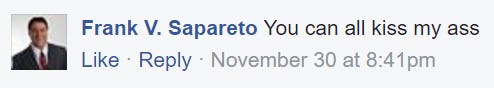 Sapareto then signaled he’d had enough. “You can all kiss my ass,” he wrote.