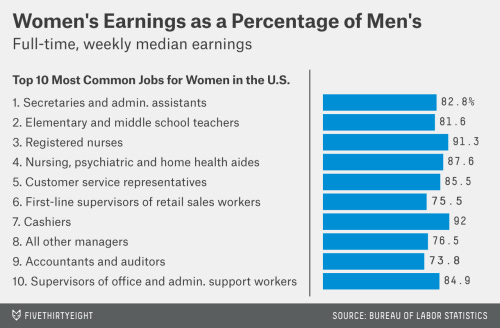 FiveThirtyEight also drilled down and analyzed the pay gap in the 20 most common occupations for full-time female workers. In all 20, women earn a lower median weekly salary than men.