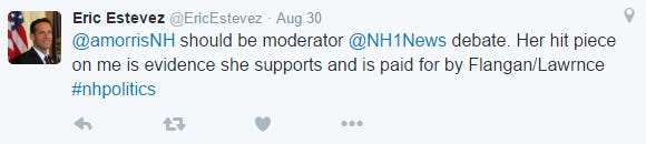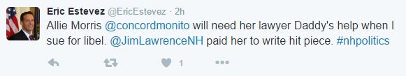 In an interview broadcast on Hudson public access television, Estevez repeated his assertion that the Lawrence campaign paid Morris to write a negative profile. “I believe you are referring to an article written by Allie Morris of the Concord Monitor, who was actually paid off by the Jim Lawrence campaign to write this article,” Estevez told interviewer Peggy Huard.