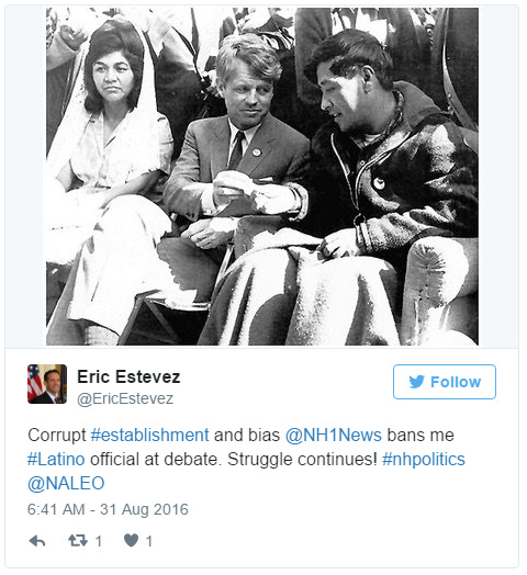 “Corrupt #establishment, @nh1news bans me #Latino official at debate. Struggle continues!” he tweeted. “Corrupt @NHGOP hates me and other minorities, unless [they’re] obedient like #fake Jim Lawrence,” he added. “I’m young, successful, Latino unafraid to challenge establishment. 3 strikes against me according to corrupt @NHGOP [biased] media.”