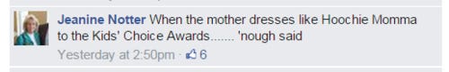 Rep. Jeanine Notter (R-Merrimack) disagreed and fixed the blame on Michelle Obama. “When the mother dresses like Hoochie Momma to the Kids’ Choice Awards……. ‘nough said,” she wrote in a comment.