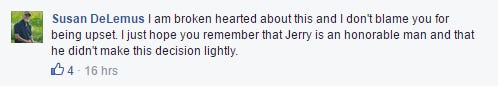 “I am broken hearted about this and I don’t blame you for being upset,” she told friends on social media. “I just hope you remember that Jerry is an honorable man and that he didn’t make this decision lightly.”