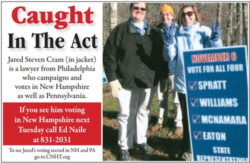 Naile then ran a half-page ad (pictured at the top of this story) in the The Messenger a week before the election, which GraniteGrok faithfully reproduced. “Caught in the act,” the ad read. “Jared Steven Cram … is a lawyer from Philadelphia who campaigns and votes in New Hampshire as well as Pennsylvania. If you see him in New Hampshire next Tuesday, call Ed Naile…”