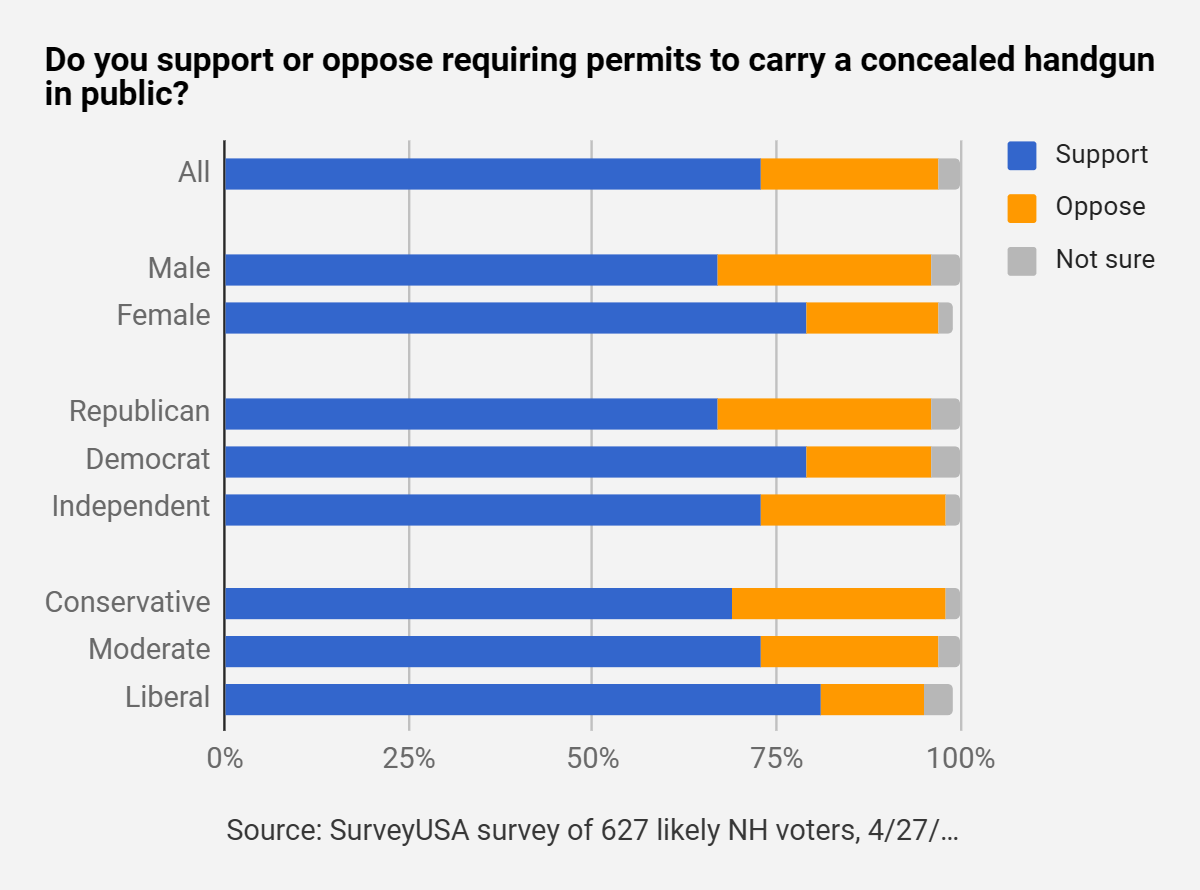 The survey was commissioned by Everytown for Gun Safety, an advocacy organization that supports legislation to prevent gun violence. SurveyUSA interviewed 627 likely New Hampshire voters on April 27-28, 2015. The survey has a margin of error of +/-3.5%.