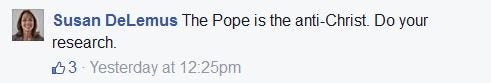 “The Pope is the anti-Christ. Do your research,” DeLemus wrote on her Facebook page.