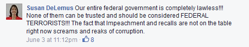 Delemus’ wife, former state House Rep. Susan DeLemus (R-Rochester), agrees with her husband. “Our entire federal government is completely lawless!!!” she writes. “None of them can be trusted and should be considered FEDERAL TERRORISTS!!! The fact that Impeachment and recalls are not on the table right now screams and reeks of corruption.”